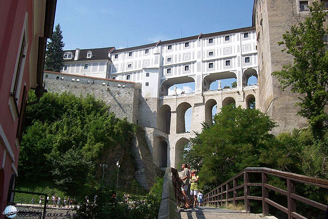 , ami nagyon jópofa: lényegében két hegyen fekszik (van vagy öt udvara, palotákkal körbeépítve) – a két hegyet meg a várpalota hatemeletes (!) fedett hídja köti össze. Azaz: az alsó kettő csak boltív, felette oldalról nyitott átjáró a szekereknek, a felett a palota vendégei zárt folyosón járhattak át a Várszínházba (Gödöllő mellett Közép-Európa másik barokk színháza!), majd felette (szintén fedett) szinten a hercegkisasszonyok 🙂 jártak át a palotakertbe. Legfelül meg nem tudom, ki.